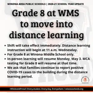 Due to a rise in positive COVID-19 cases in the 8th-grade class at the Winona Middle School, and a sharp, sudden increase in the number of students who need to quarantine, all students in Grade 8 at the middle school will shift into distance learning immediately until at least Monday, May 3, 2021.