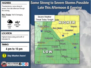 Forecasters say areas of eastern Buffalo and Trempealeau Counties have the highest possibility to see storms bring damaging winds and hail from 4-10 p.m.