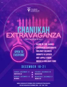 More information about Chanukah and a local schedule of events is available at www.chabadsouthernmn.com/chanukahextravaganza.
