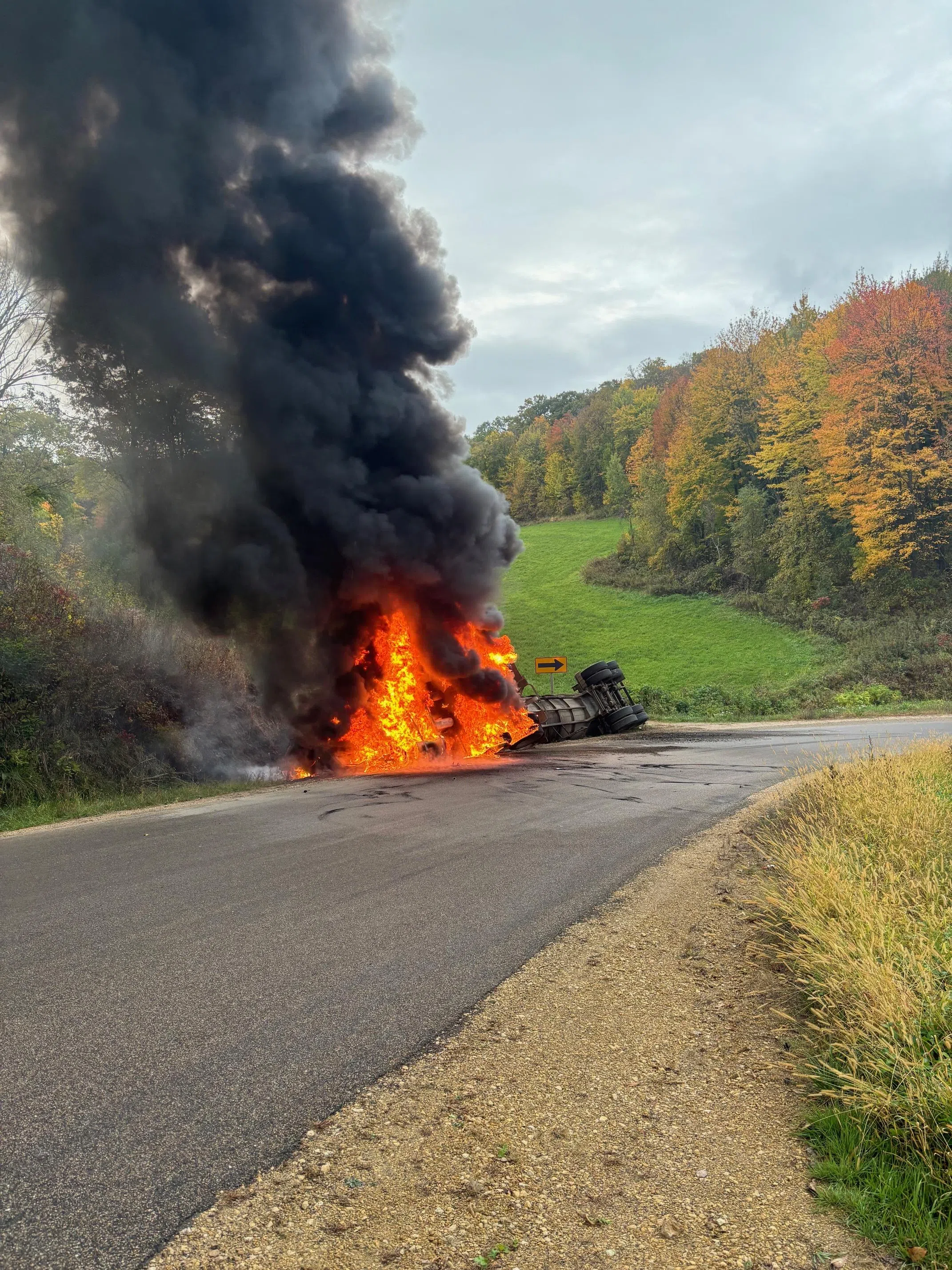(KWNO)-A semi-truck rolled over and caught fire Thursday in Canton Township. The Buffalo County Sheriff’s Office was called to County Road JJ around 8:45 am Thursday where deputies found the semi fully engulfed in flames. Two witnesses had helped the driver out of the semi.