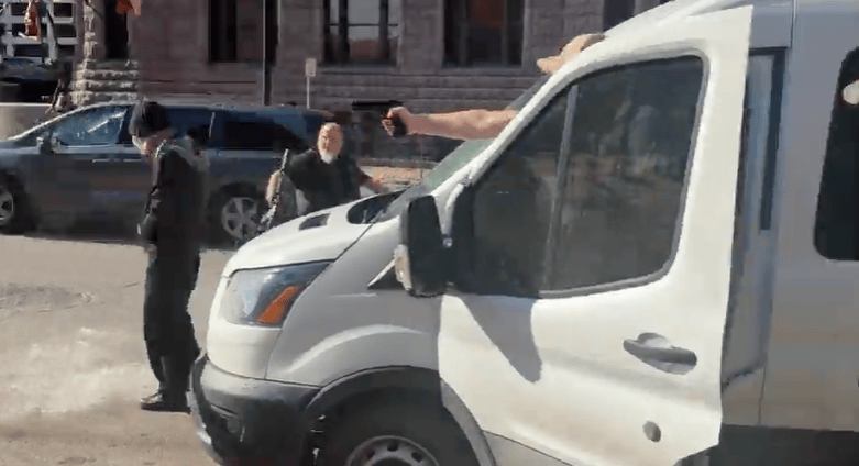 The men, who are based in Oklahoma are each charged with making threats of violence with reckless disregard and brandishing replica firearms, both of which are felonies.